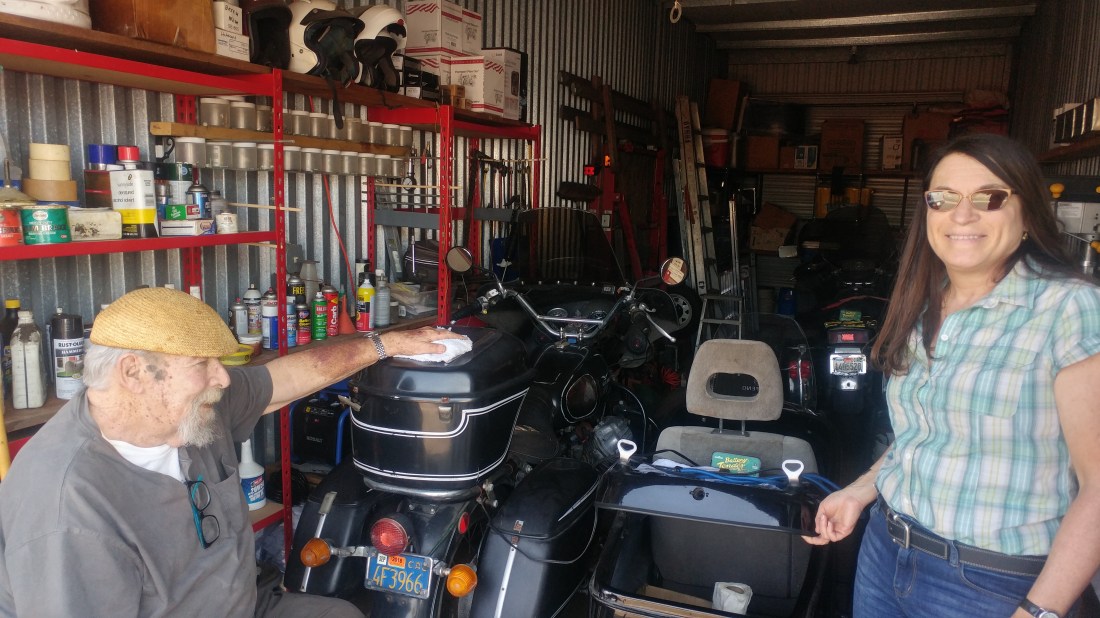 We did a couple hours of work on the bike. I mounted a car horn and a rear foot peg on the left, the sidecar frame was in the way on the right side. The fairing was also removed in preparation of the fork leg swap on deck for tomorrow. The saddle bags were next. The mounting brackets were loose so I drilled out the rivets and replaced them with hex head machine screws. New latches were then installed so the bags can be locked and a couple other repairs made.
