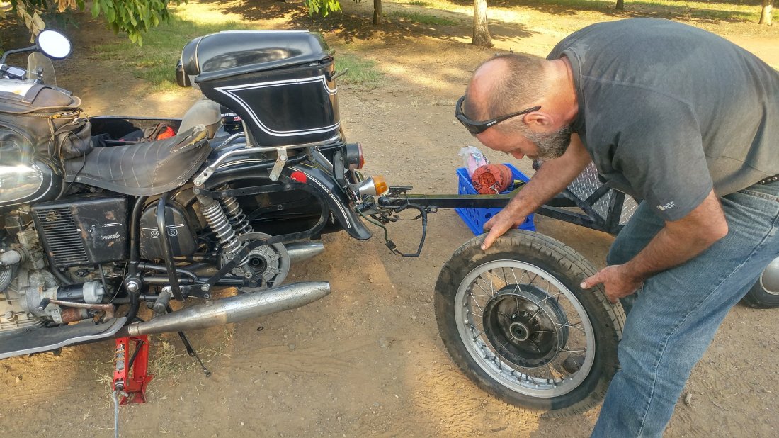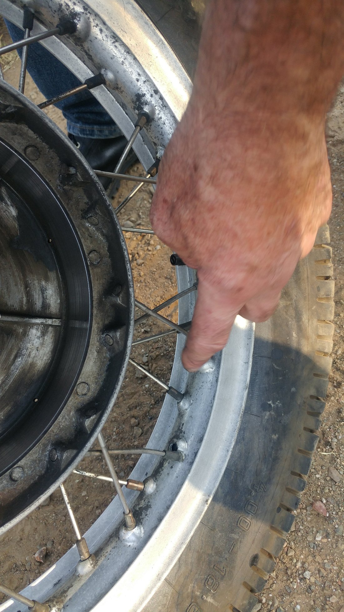 Removing the wheel and the tire went well, but the spokes were a real problem. One option was to pull spokes out of the spare front wheel. That would mean dismounting that tire. On top of that two of the spokes were seized into the hub and I couldn’t get them out.