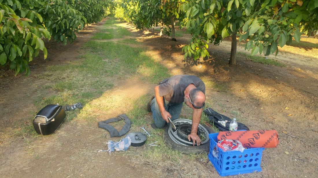 I was getting into the groove and Bubba seamed to be running better as we progressed. Suddenly on a long straight the bike became hard to handle. The back tire had flatted. I got the bike off the road and onto a flat area adjacent to an avocado grove. Looking things over I saw that, four spoke nipples had broken.