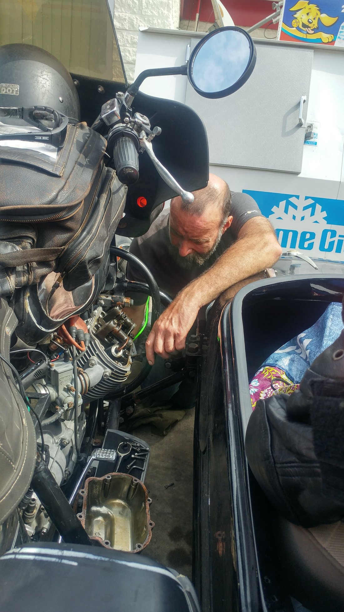 Back on my feet I removed my duffle bag from the trailer and laid it by the bike. Tools out, the generator belt cover, left valve cover and spark plugs were removed.