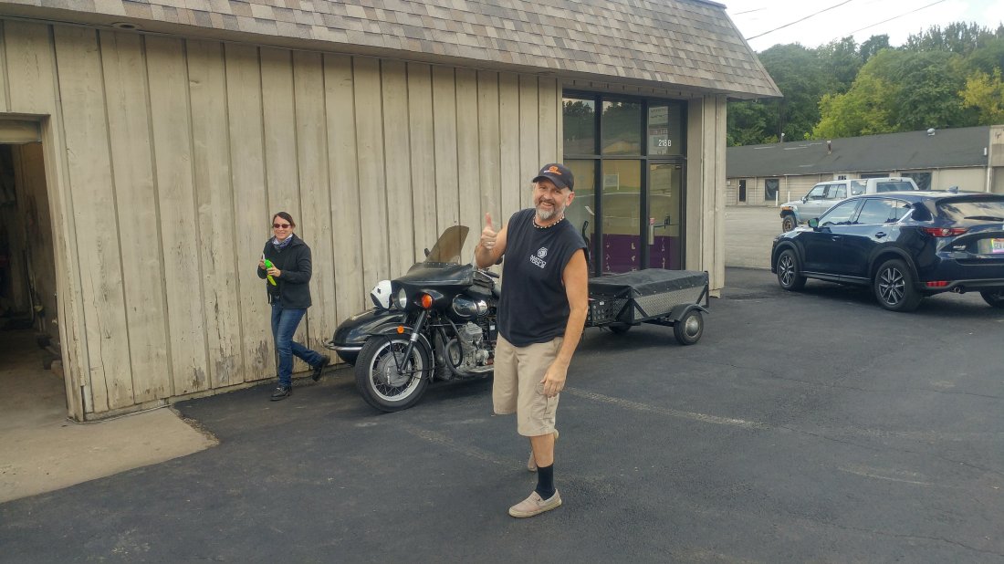There was a 60’s VW Beetle sitting in the bay. When Owen walked out I jokingly told him I needed some parts off the car, they used the same generator and voltage regulator as the Guzzi. I then explained the issue with the bike. “Of course you can use some power”, he exclaimed as we walked outside. Owen was totally cool and was very interested in the bike and our trip.