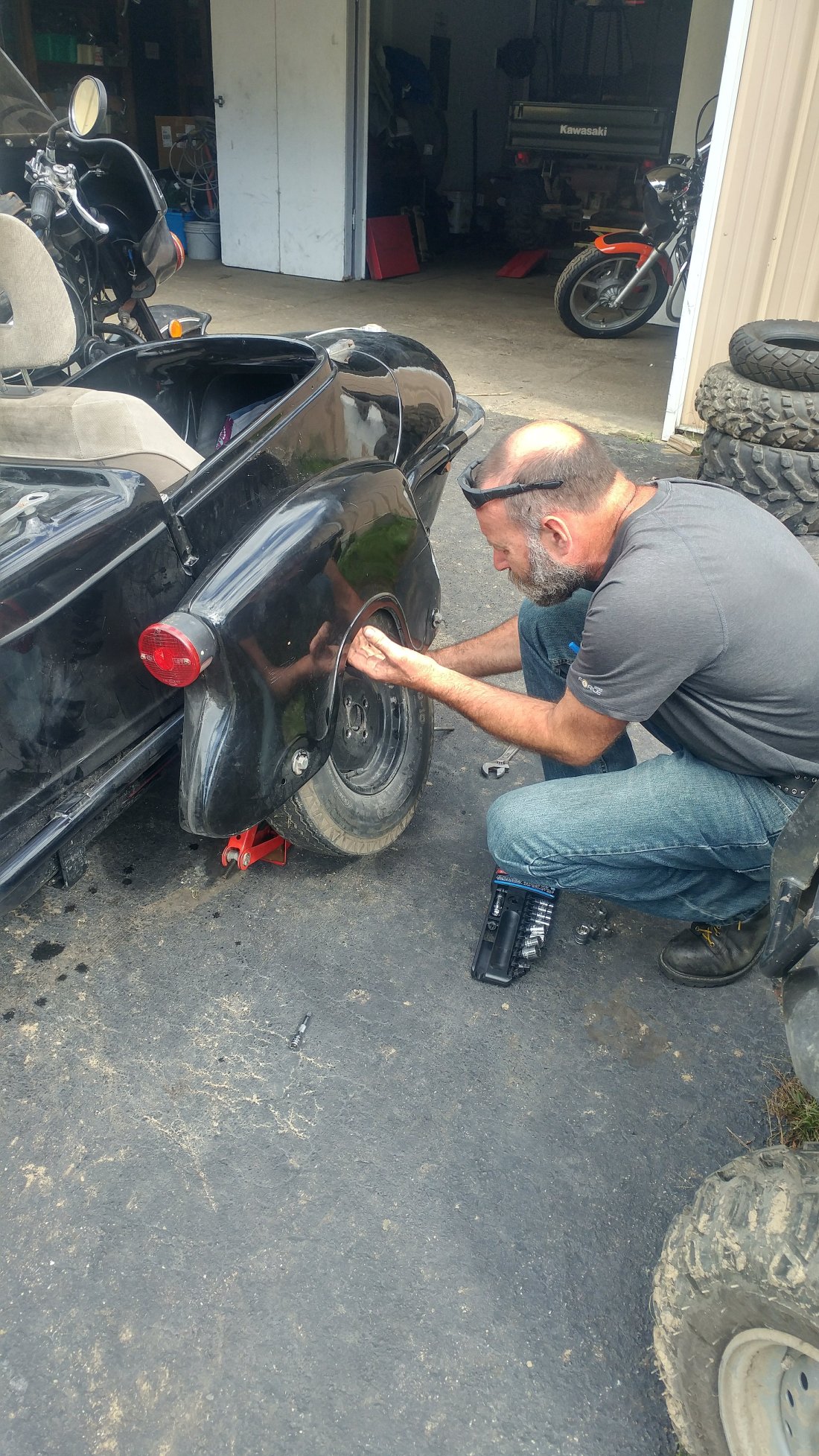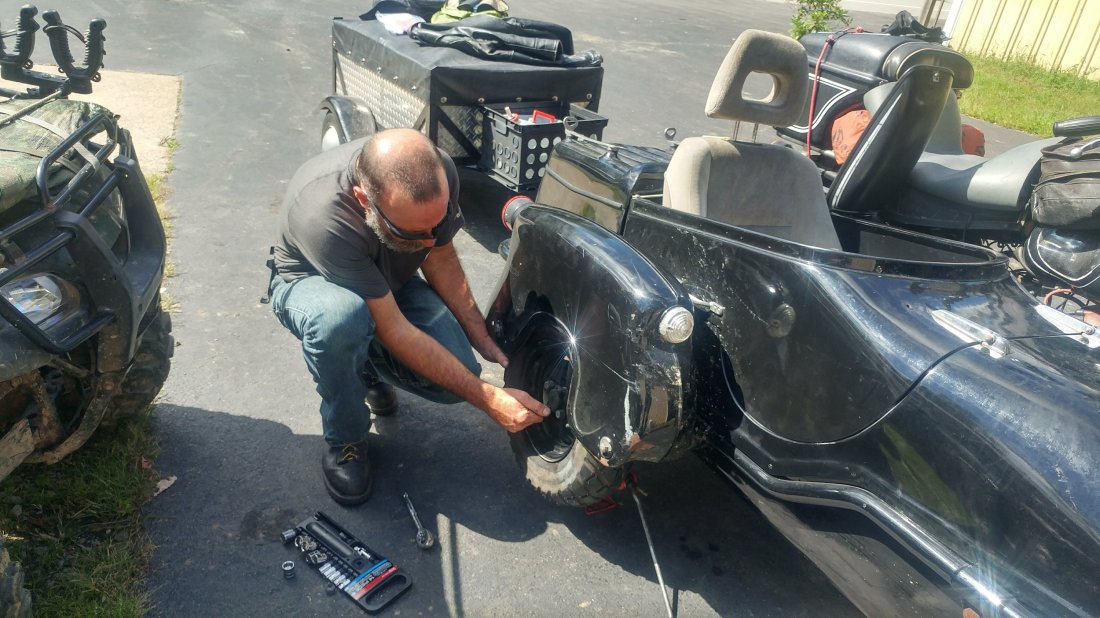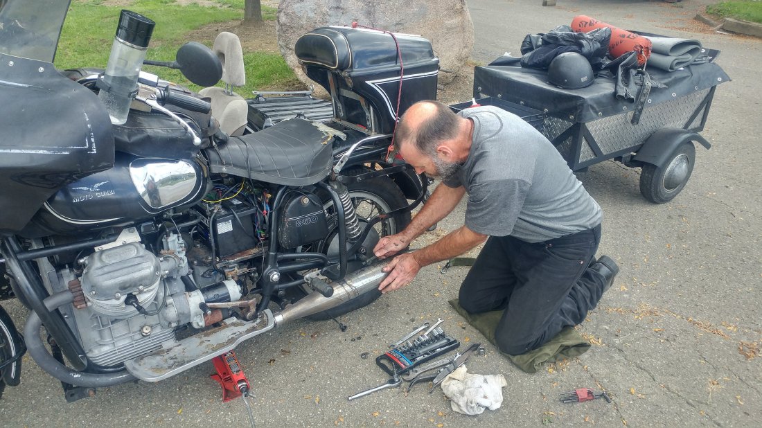 Breakfast over, work cloths on, it was time to check the valves for the third time, cold, just like Don said. They were pretty close, but I tweaked them a bit. While doing the work I noticed the sidecar tire was really looking like a racing slick. “Man, I need to deal with that.”