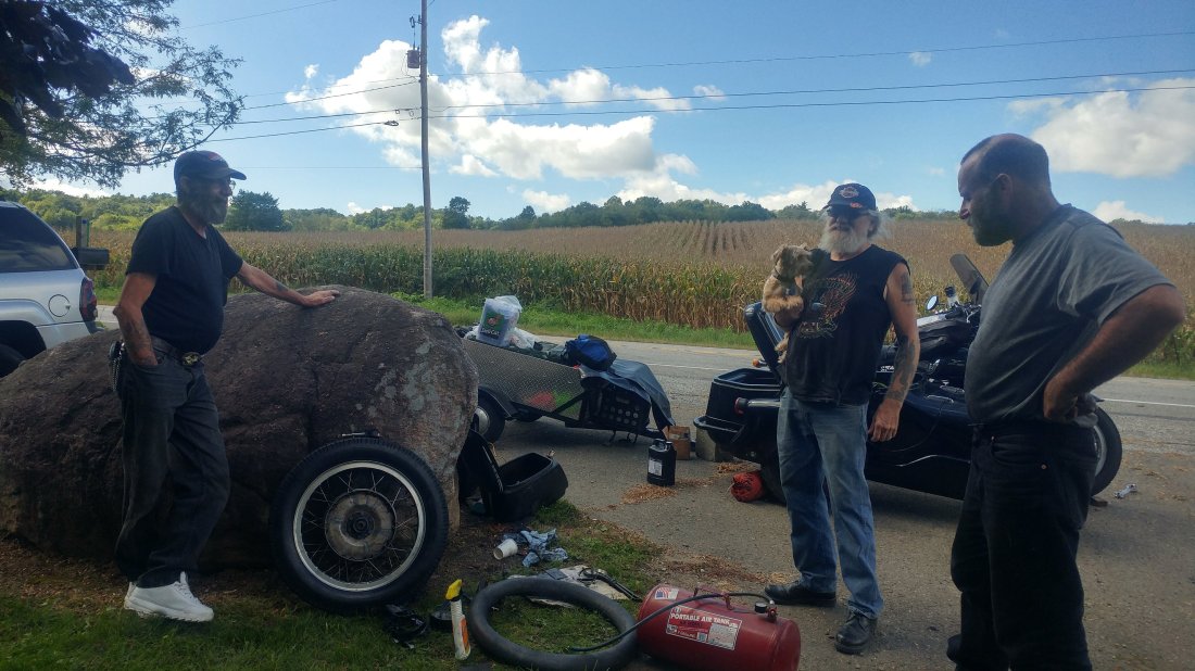 Bikes rode by indifferently. Then Ken rolled up on his Harley and asked if we needed help. “A tank of compressed air would be great”, I replied. “I’ll be back in about 20 minutes.”