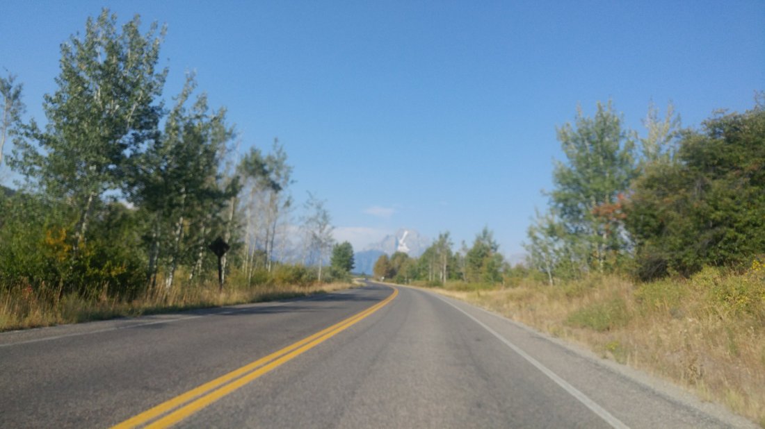 Heading north towards Yellowstone, the land was flat and nondescript. Eventually the road angled down to a valley floor and trees began to appear. The Tetons were there in the distance.