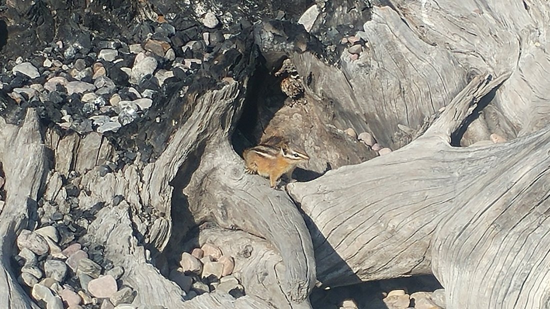Around another right hand corner we descended a hill into an active construction zone. We had to wait while some equipment was cleared off the roadway. A black SUV was in front of us. A woman on a Triumph rolled in behind. Once released we had a fresh ribbon of asphalt to run and run we did. On a long straight I waved the Triumph past and it and the SUV slowly faded from sight. Eventually the pavement ended and we dropped back onto gravel. There was a good sized opening to my right so I pulled over to add a layer. Just as I stopped a dear crossed the road about 100 feet ahead. If I hadn’t pulled over we might have gotten up close and personal.