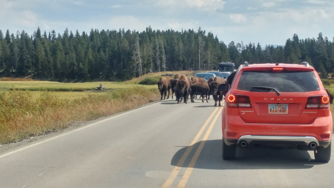 Rounding a left hand bend we were forced to stop. There were bison ahead walled in by traffic.