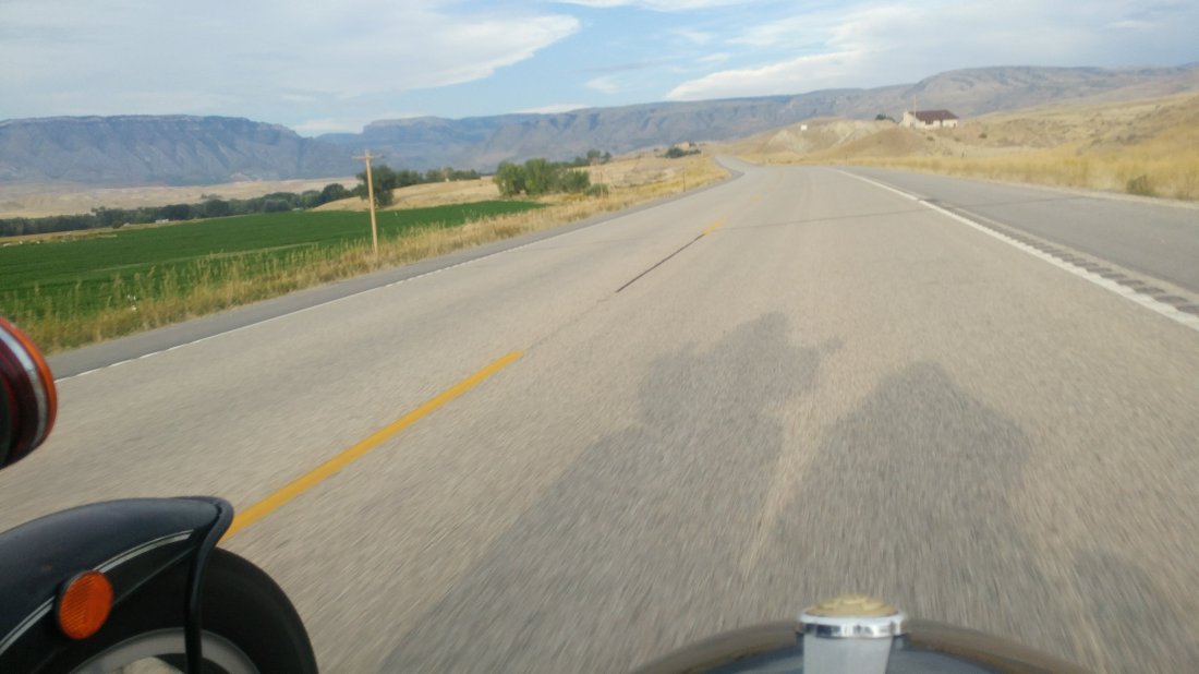 A sign appeared indicating a downhill grade of 8%. The road dropped and dropped and dropped. Back and forth we danced through myriad turns. Even with Bubba in 3rd and the throttle closed I still had to brake. We passed a semi that was barely moving. The smell of hot brakes filled the air. Being supper vigilant I scanned for deer while trying to watch the road. It had to have taken at least thirty minutes to get off the mountain, maybe more. Even though the speed limit was back to 65 mph, I putted along in fourth. The desire to get to Sheridan in as little time as possible was overruled by a stronger desire not to hit a 150 lb animal at speed.